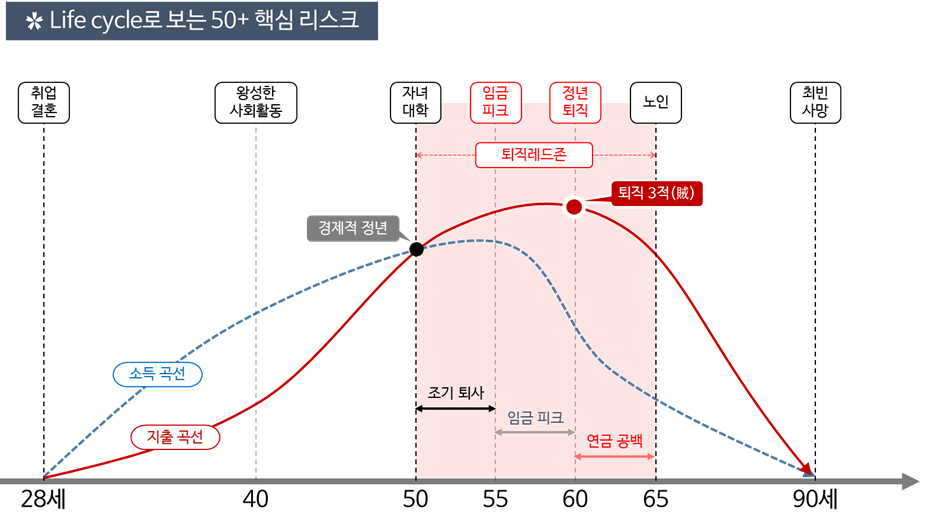 이 시기는 소득과 지출의 균형이 깨지는 위험이 다가오기 때문에, 철저히 대비하지 않으면 퇴직 후의 삶의 질이 급격히 하락하는 위험과 마주할 수 있다.